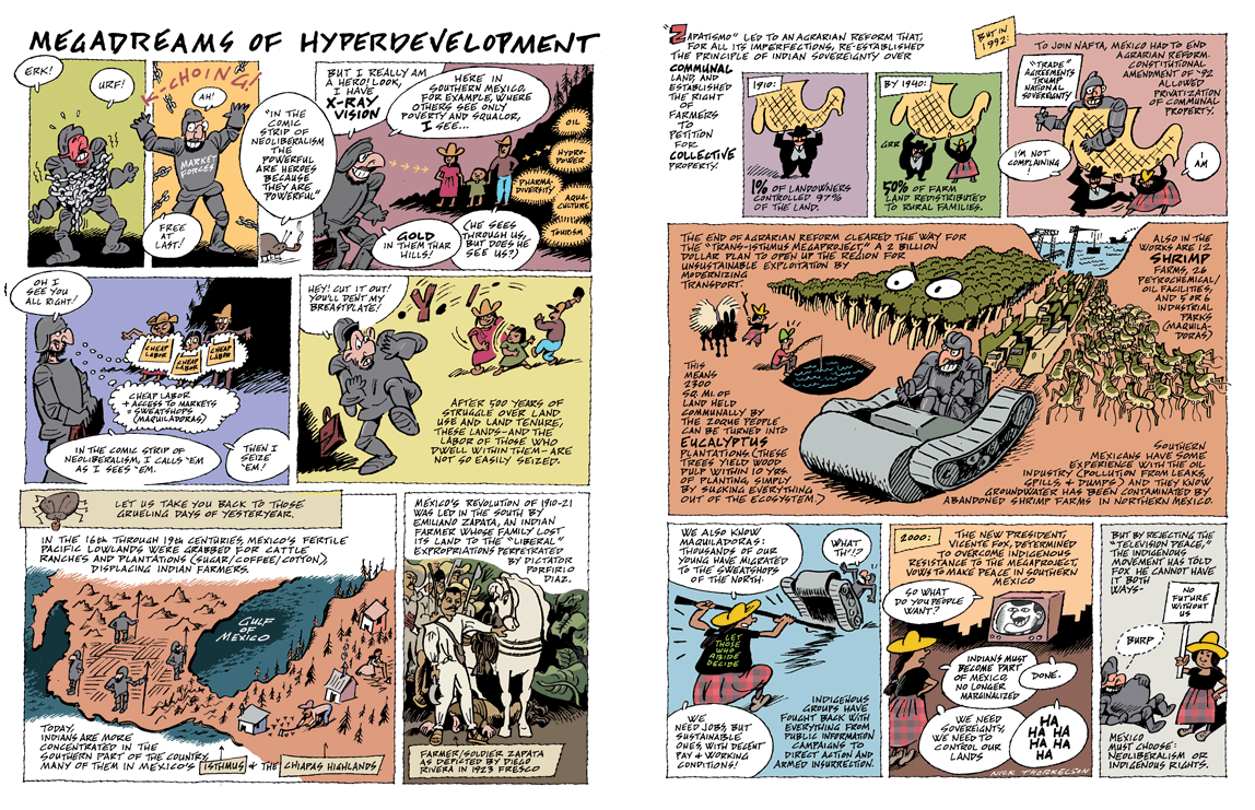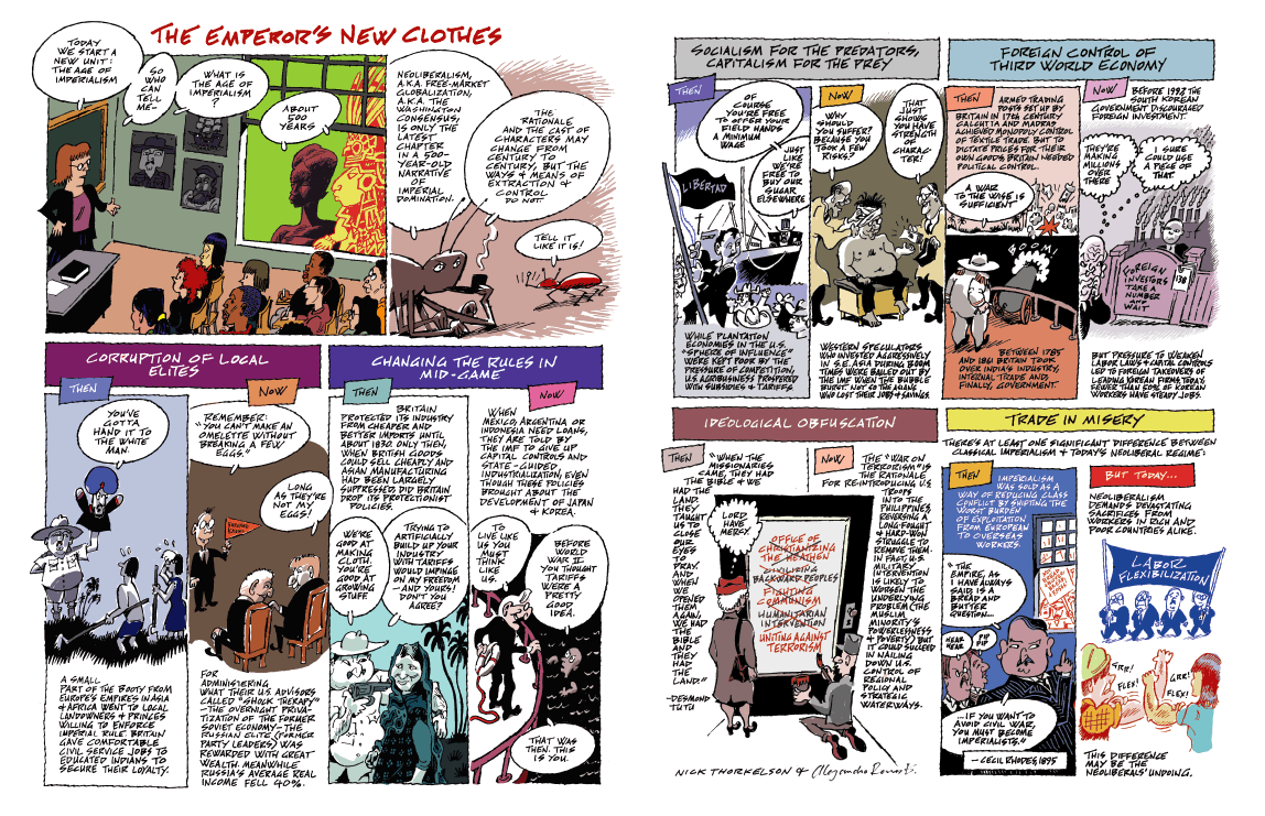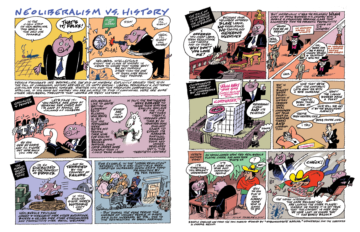 To celebrate D&S's 45th anniversary, former D&S art director Nick Thorkelson has made full-color prints of his amazing “Comic Strip of Neoliberalism” series published in the magazine in the early 2000s. The series was a collaboration with former D&S co-editor Alejandro Reuss. (For more info on the series, click here.)