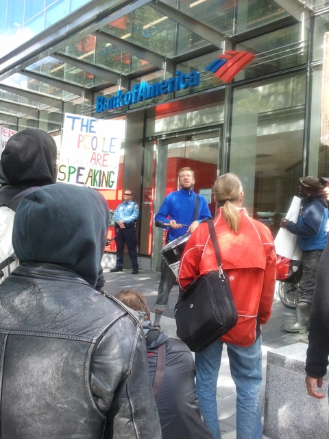 I went off to look for the bank, and ended up walking around the back side of the White House (which is looking quite militarized these days!) and then wandering up K St. toward Macpherson Square. There were lots of people in the streets on their lunch hour. I heard chanting and a loud drum, and there was a parade of about 20 to 30 people marching (it turned out) toward a Bank of America branch for another action. Rather than an occupation it was a "move your money" action--one of the activists was closing his account, and the group rallied in front of the bank branch for about 45 minutes. Here’s what the action looked like: