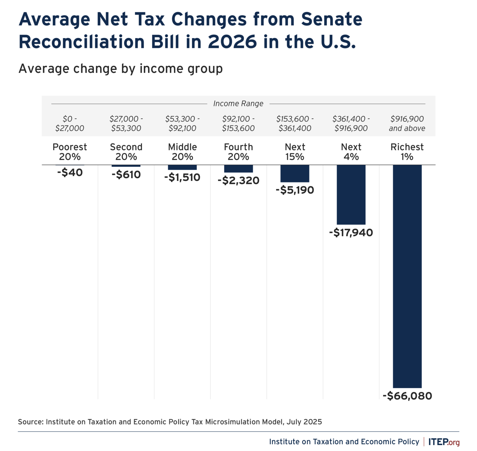Figure 1 from the Institute on Taxation and Economic Policy (ITEP) makes it clear that the primary mission of the bill was to deliver a $4.5 trillion tax cut that overwhelmingly benefited the richest taxpayers. The bill made permanent Trump’s 2017 tax cut, which included lowering the top income tax rate, increasing the exemption for estate taxes, and slashing corporate taxes. The average tax cut next year will be $30 for the poorest 20% of taxpayers, $1,580 for the middle fifth, and $68,430 for the top 1%, with incomes of at least $916,900.