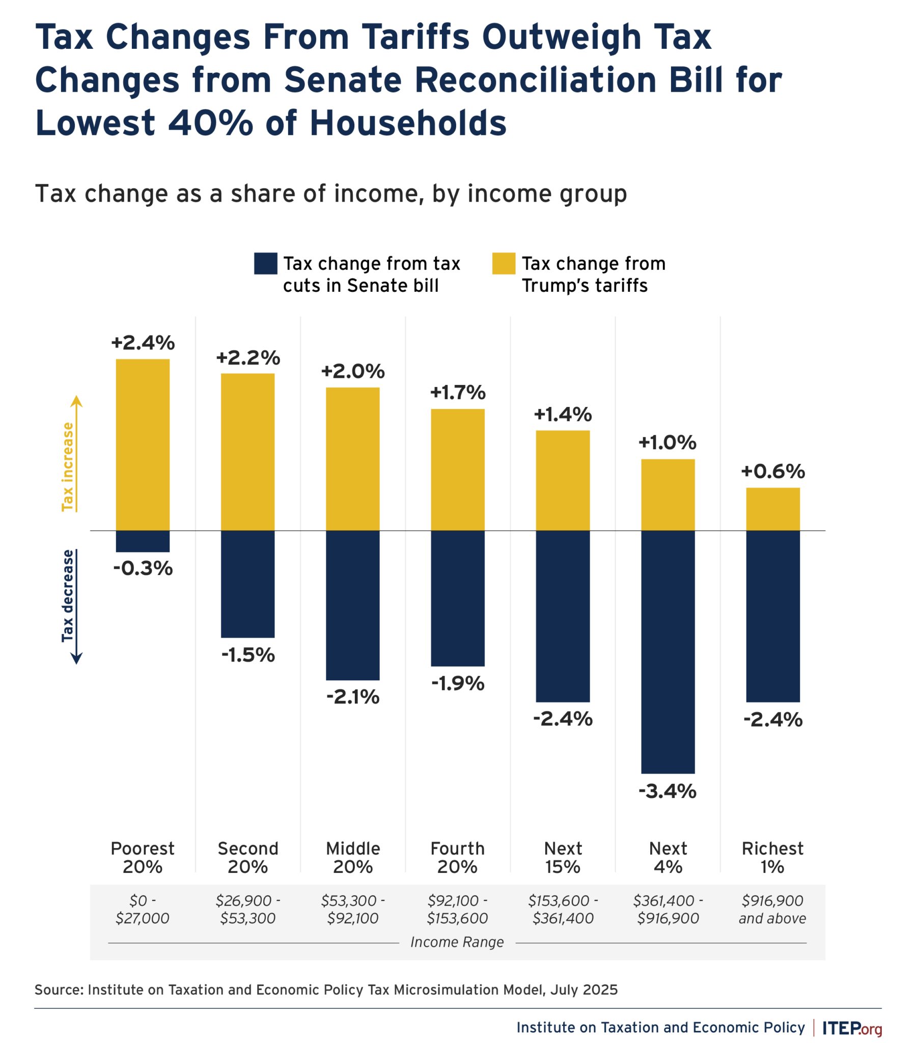 This big, ugly bill comes on top of Trump’s tariffs, which are pretty damn ugly as well. Tariffs are a sales tax on imports. They push up the prices faced by consumers. Their economic burden falls disproportionately on poor and middle-income taxpayers who consume a larger portion of their income than better-off taxpayers. Adding on the tax burden of higher tariffs will leave the poorest 40% with less income after taxes compared to when Trump’s second term began. And that’s without taking into account the additional reciprocal tariffs Trump promises to reimpose on July 9. Figure 2 below, also from ITEP, makes that clear.
