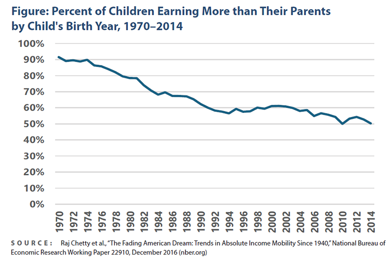 In late 2016, economist Raj Chetty and his multiple coauthors published their study, “The Fading American Dream: Trends.” They documented a sharp decline in mobility in the U.S economy over nearly half a century. In 1970, the household income (corrected for inflation) of 92% of 30-year-olds (born in 1940) exceeded their parents’ income at the same age. By 1990, just three-fifths (60.1%) of 30-year-olds (born in 1960) lived in households with more income than their parents earned at age 30. By 2014, that figure had dropped to nearly one-half. Only 50.3% of children born in 1984 earned more than their parents at age 30. (The figure below depicts this unrelenting decline in social mobility. It shows the relationship between a cohort’s birth year, on the horizontal axis, and the share of the cohort whose income exceeded that of their parents at age 30.)