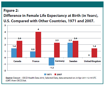 Fig 2: Difference in Female Life Expectancy at Birth (in Years), U.S. Compared with Other Countries, 1971-2007