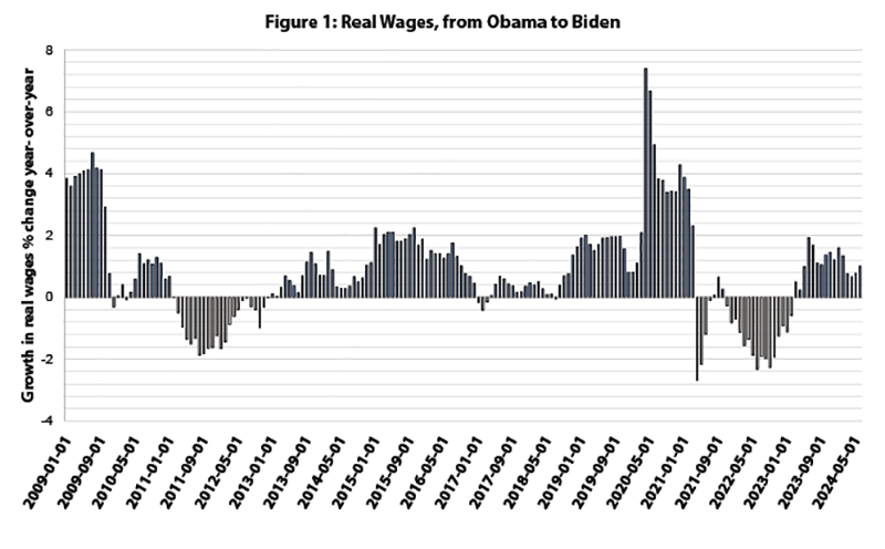 In addition to low unemployment, Krugman’s case rests on real wage growth. (“Real wages” are wages and salaries adjusted for changes in overall prices.) We know that inflation decreased significantly starting in the spring of 2023, according to the Consumer Price Index. Furthermore, nominal wage growth for production and nonsupervisory workers has started to outpace inflation, so that real wages have risen since March 2023 (see Figure 1). So, even though real wages were falling during a portion of the first half of Biden’s term, real wages are now rising at about 1% per year.