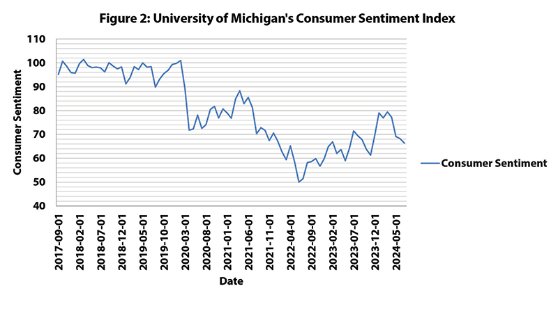 Despite an apparently good economy, in terms of unemployment and real wages, Krugman claims that sentiments have not fully incorporated this rosy picture. Krugman’s assessment is corroborated by different sources. The Consumer Confidence Index compiled by the University of Michigan indicates that confidence remains below pre-pandemic levels (see Figure 2). As the chart shows, while there has been some recovery since mid-2022, the massive dip in consumer sentiment following the pandemic is very clear and continues to affect voters’ view of the economy.