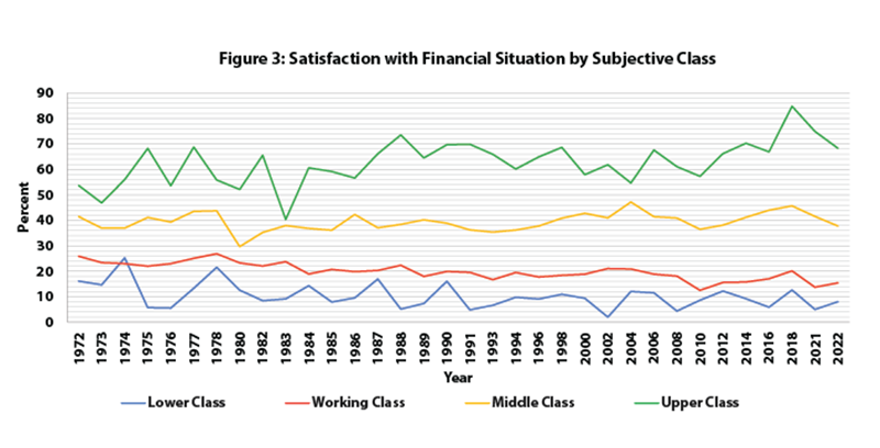 It is, however, more informative to consider financial satisfaction when broken down by “subjective class identification.” Respondents are asked to select which of four social classes they belong to, and the four options are: lower class, working class, middle class, and upper class. (It is worth pointing out that if we were to use more objective measures of class identification, like occupation, income, or wealth, we would possibly see different results.) Nevertheless, the stratification remains striking if we consider subjective identification. Only those who consider themselves “upper class” report being satisfied with their financial situation, and in relative terms, members of the working class and middle class report considerable dissatisfaction. This has been the case for decades (see Figure 3).